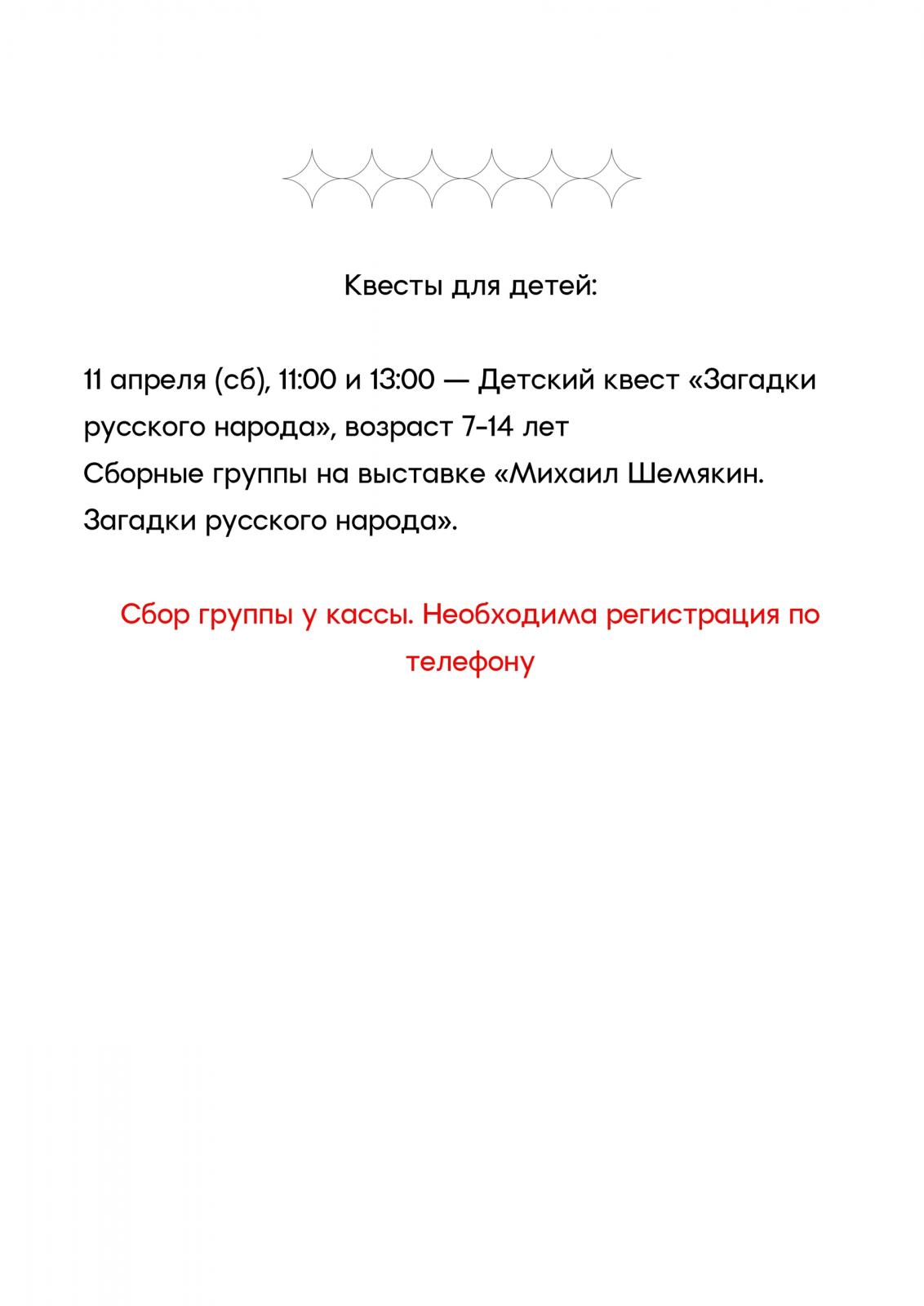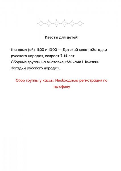 11 апреля (сб), 11:00 и 13:00 — Детский квест «Загадки русского народа», возраст 7-14 лет